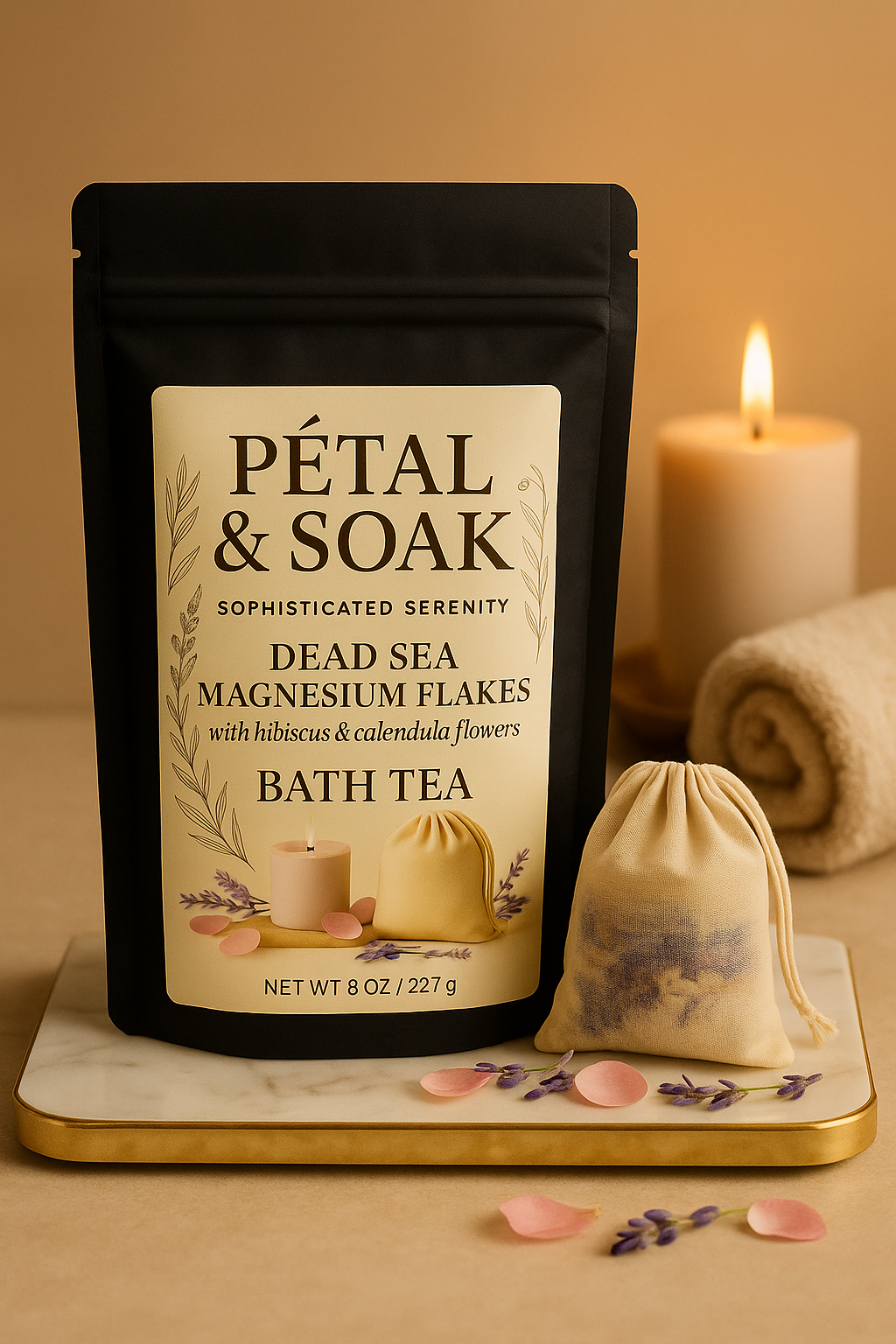 Pétal & Soak is handcrafted with Dead Sea magnesium flakes, essential oils, and real botanical petals—no artificial additives, fillers, or harsh chemicals. It's a clean, natural soak designed for both wellness and skin care.